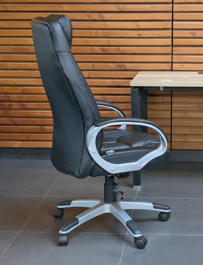 Fauteuil 249 Dossier / Accoudoirs : Dossier et appui-tête en polyuréthane. Densité de la mousse : 32 kg/m3. Accoudoirs fixes en nylon recouverts de polyuréthane. Assise : Assise en polyuréthane. Densité de la mousse : 35 kg/m3. Réglage / Mécanisme : Mécanisme basculant centré. Blocage du dossier en position droite ou libre. Possibilité de régler l’intensité de basculement et la hauteur du siège. Vérin / Piétement / Roulettes Vérin 100/15 mm Class 3. Base 700 mm en nylon avec placage chrome. Roulettes 50 mm en nylon. Fiche technique en PDF Coutures noires façon sellier et micro perforation façon sport. Fiche technique en PDF