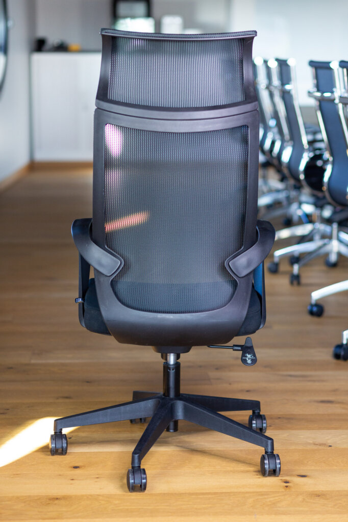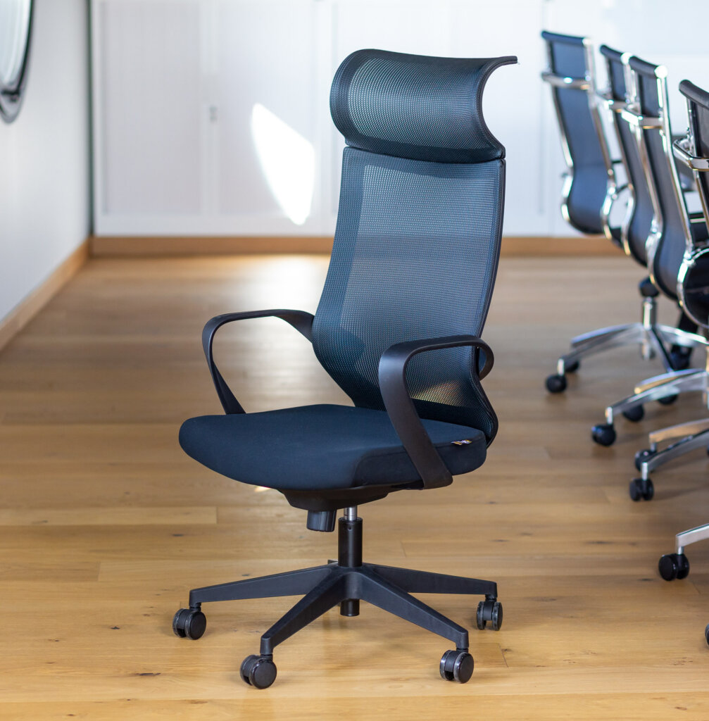 Fauteuil 220 Dossier / Accoudoirs : Dossier et appui-tête fixe en résille noire. Accoudoirs fixes en nylon noir. Assise : Revêtement tissu noir. Épaisseur de mousse : 70 mm. Densité de mousse : 35 kg/m3. Réglage / Mécanisme : Basculant centré. Blocage du dossier en position droite ou libre. Réglage de la tension de basculement grâce à la molette située sous l’assise. Vérin / Piétement / Roulettes Vérin 100/40 Classe 3. Base nylon 680 mm. Roulettes en polyuréthane 60 mm. Fiche technique en PDF Certifications : Fiche technique en PDF